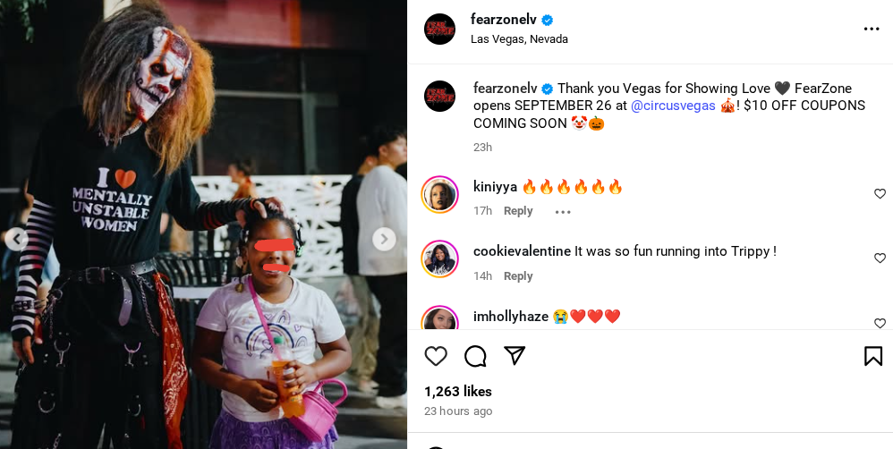 This post from the FEAR ZONE Instagram page is dated 9/6/25. It shows a FEAR ZONE character at an outdoor event, touching a child while wearing a shirt that says “I (heart symbol) MENTALLY UNSTABLE WOMEN.” We’ve concealed the identity of the child.