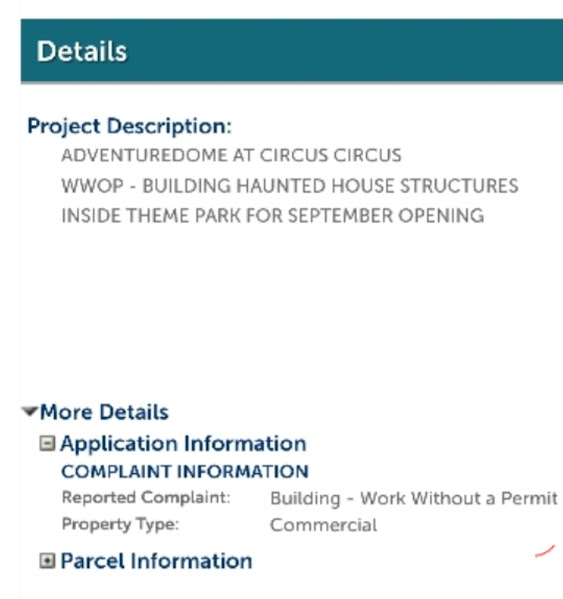 Also, we have confirmed that an active complaint has been made against the construction of FEAR ZONE due to the lack of a building permit: