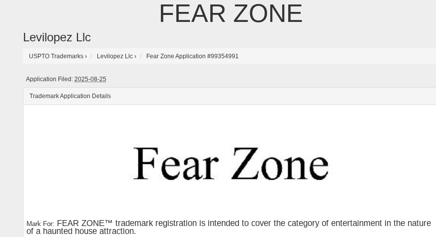Additionally, we’ve uncovered the trademark application that directly links Anthony Levi Lopez to FEAR ZONE. You can view it in its entirety here.